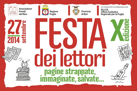 L’Associazione dei Presìdi del libro promuove anche quest’anno, con il patrocinio dell’Ufficio Scolastico Regionale per la Puglia, la X^ edizione della Festa dei lettori che prenderà il via sabato 27 settembre p.v., nella giornata di martedì 23 settembre p.v. è prevista però un’anteprima della manifestazione.