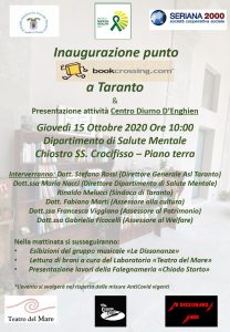 Questo primo e unico punto di BookCrossing di Taranto aperto a tutta la cittadinanza sarà inaugurato, in occaione della Giornata Internazionale della Salute Mentale, giovedì 15 ottobre p.v. alle ore 10:00 presso il Dipartimento di salute mentale – Chiostro SS.Crocifisso in via SS. Annunziata a Taranto.