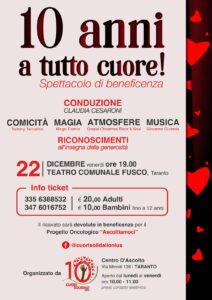 Si terrà il prossimo 22 dicembre alle 19:00 al Teatro Fusco di Taranto lo spettacolo di beneficenza dal titolo 10 anni a tutto cuore! organizzato dall’Associazione Cuori solidali ODV per festeggiare il decimo anno di attività.