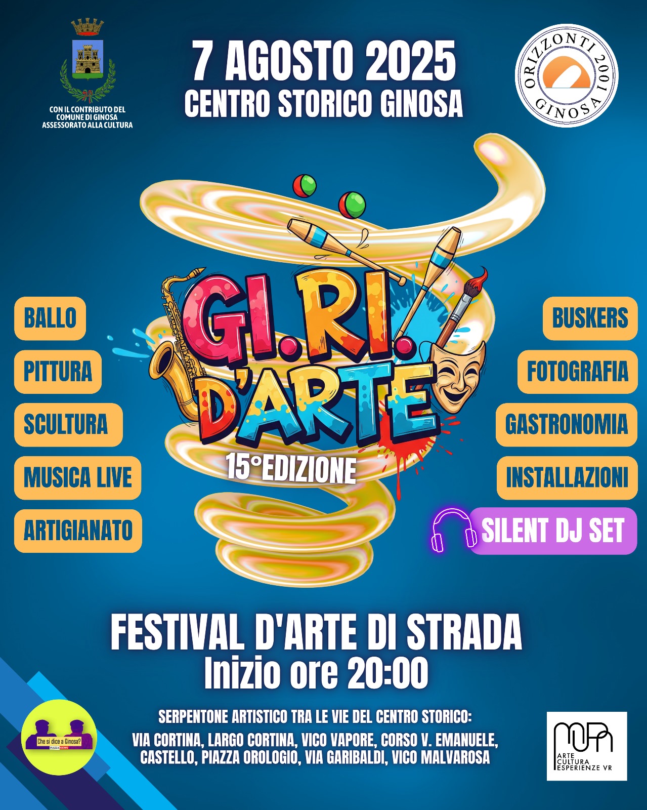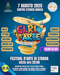 Ginosa torna a farsi palcoscenico per la 15ª edizione di Gi.Ri. d’Arte, il festival organizzato dall’Associazione Orizzonti 2001 APS che celebra l’arte in tutte le sue forme nella suggestiva cornice del centro storico di Ginosa.