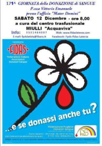 L’Associazione FIDAS – Federazione Italiana Associazioni Donatori Sangue di Laterza in occasione della 171^ Giornata della Donazione di Sangue invita quanti volessero contribuire alla raccolta di sangue a donarlo presso il Centro Trasfusionale Miulli di Acquaviva delle Fonti presentandosi dalle ore 8:00 alle 11:00 di sabato 12 dicembre.