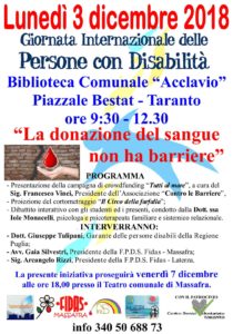 In occasione della Giornata Internazionale dei diritti delle persone con disabilità, istituita sin dal 1982 dall’Assemblea generale dell’ONU, l’Associazione “Contro le Barriere” e le sezioni di Massafra e Laterza della Federazione Pugliese Donatore Sangue Pugliese – FIDAS organizzano per lunedì 3 dicembre dalle 9:30 alle 12:30 presso la Biblioteca Comunale “Acclavio” – Piazzale Bestat Taranto un evento di sensibilizzazione riguardo ai temi della disabilità, ancora troppo stigmatizzata e oggetto di “distorsioni” cognitive, nonché sull’importanza vitale della donazione del sangue.