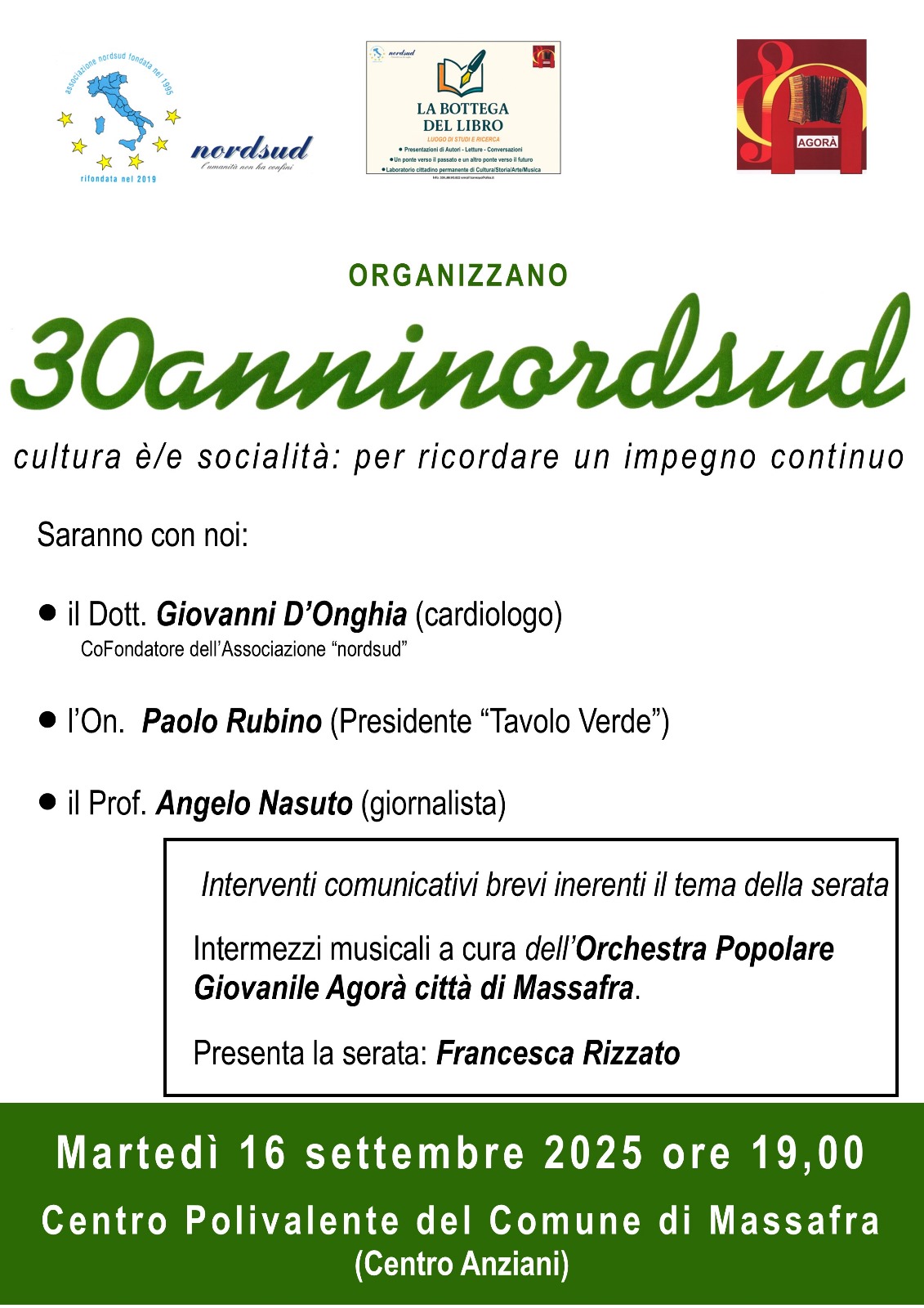 L’Associazione Nord Sud ETS – APS in collaborazione con Agorà APS organizza l’evento 30anninordsud – cultura è/e socialità: per ricordare un impegno continuo.