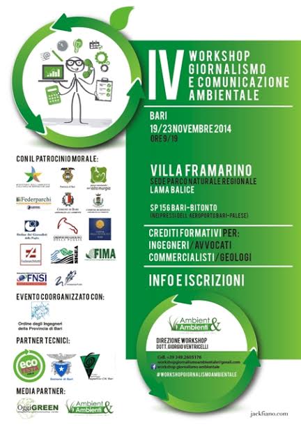 Ha avuto inizio il 19 novembre u.s. e proseguirà fino 23 novembre p.v. a Bari presso Villa Framarino, sede del Parco Naturale Regionale Lama Balice, la quarta edizione del Workshop Giornalismo e Comunicazione Ambientale.