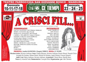 La commedia proposta dall’associazione questa volta è “A crisci fili…”, commedia brillante in due atti di C. Pisarra e P. Abatematteno, rivisitata dalla F.C. “Ce Tiempi” e realizzata con il Patrocinio del C.S.V. di Taranto.