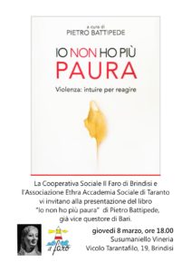 In occasione della Festa della Donna, oggi 8 marzo, La Cooperativa Sociale Il Faro di Brindisi in rete con l’Associazione Ethra Accademia Sociale di Taranto e La Casa delle Donne promuovono la presentazione del libro di Pietro Battipiede, già vicequestore di Bari, dal titolo Io non ho più paura – Violenza: intuire per reagire.