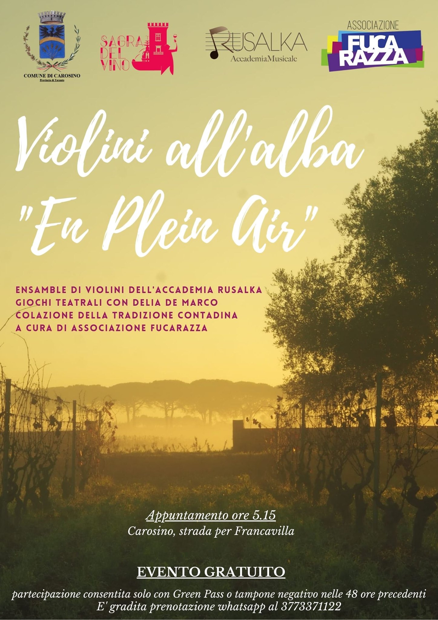 Attendere il sorgere del sole in un vigneto entrando in contatto con la natura: è Violini all’alba “En plein air”, l’evento organizzato dal Comune di Carosino, nell’ambito della “Sagra del Vino 2021”, in collaborazione con l’Associazione Fucarazza e con l’Accademia Musicale Rusalka, due realtà molto attive a Carosino.