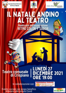 Il Natale Andino al teatro si terrà, alle ore 19.00 di lunedì 27 dicembre, presso il Teatro comunale di Crispiano, nel pieno rispetto della normativa anti Covid-19; l’evento è realizzato in collaborazione con l’associazione culturale “Il Sorriso” e con il patrocinio dell’Assessorato alla Cultura del Comune di Crispiano, del Centro Servizi Volontariato di Taranto e del Consolato Generale del Perù di Napoli, Console onorario Fabiana Capuano.