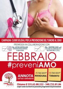 Mercoledì 15 e giovedì 16 febbraio parte la seconda campagna per la prevenzione del tumore al seno, promossa dall’ Associazione “Cuori Solidali”, in collaborazione con gli Studi Radiologici Dott. Ostillio di Manduria e Taranto.