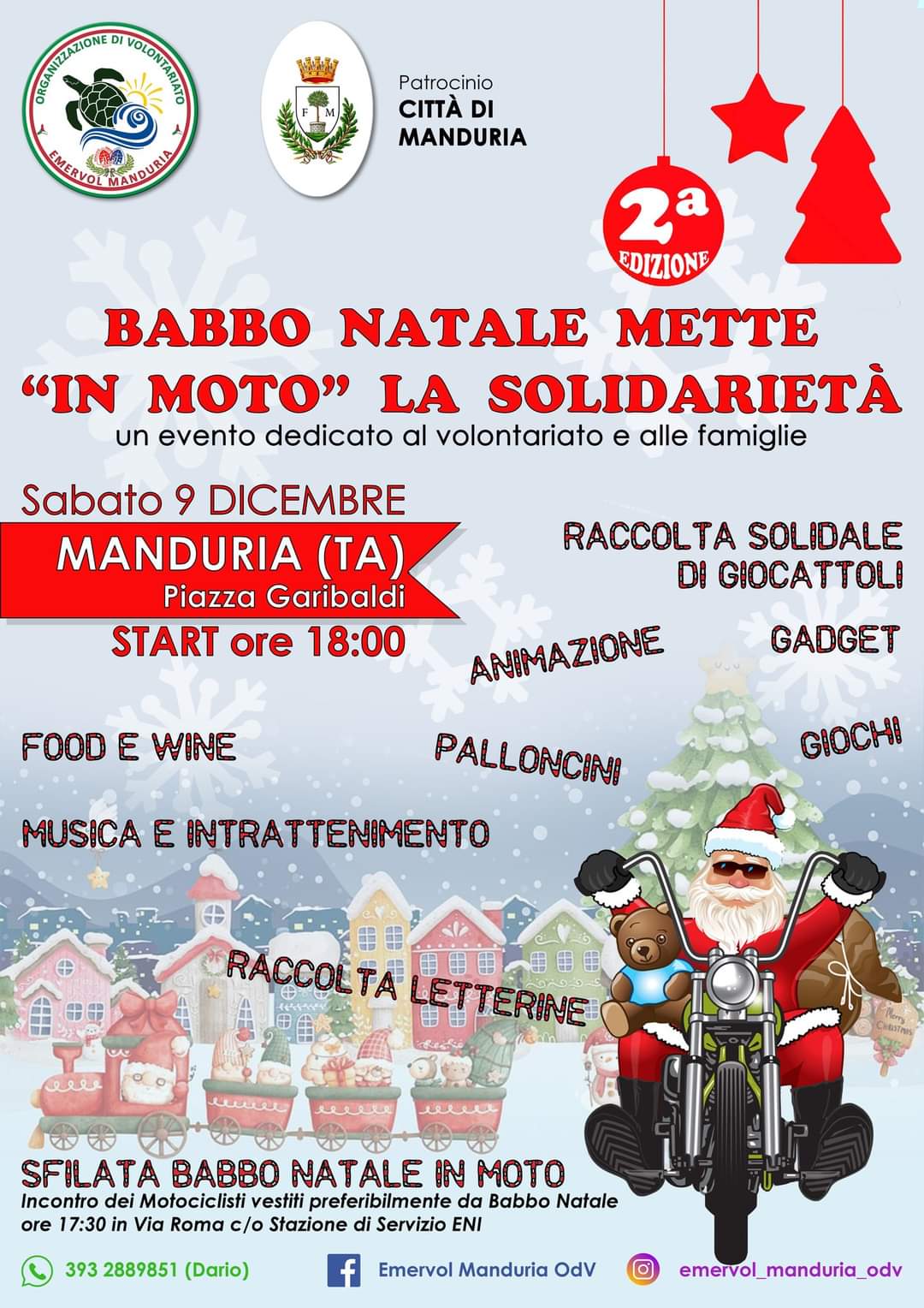 Si terrà sabato 9 dicembre p.v. la seconda edizione dell’evento dal titolo Babbo Natale mette in moto la solidarietà organizzato dall’Associazione EMERVOL Manduria ODV col patrocinio della Comune di Manduria.