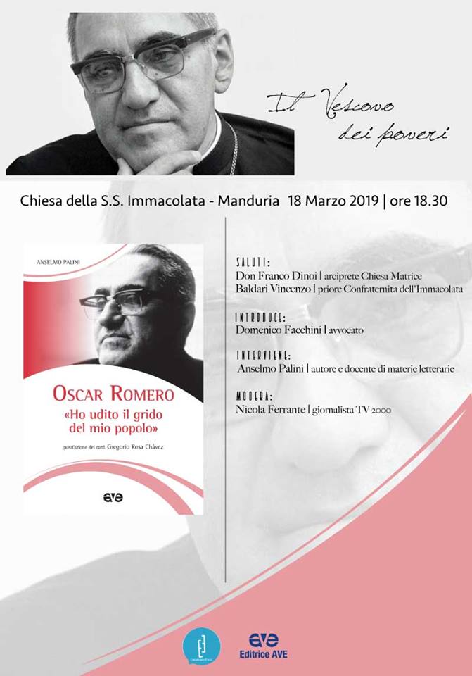 Si terrà a Manduria lunedì 18 marzo alle 18:30 presso la chiesa della SS. Immacolata la presentazione del libro di Anselmo Palini dal titolo Oscar Romero. “Ho udito la voce del mio popolo” con prefazione di Maurizio Chierici, giornalista, già inviato dal Corriere della Sera in America latina, dove conobbe e intervistò Romero; e postfazione del cardinale salvadoregno