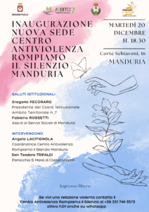 Si inaugura a Manduria domani, martedì 20 dicembre, alle ore 18.30, la nuova sede del Centro Antiviolenza Rompiamo il Silenzio: il taglio del nastro è previsto presso l’immobile, messo a disposizione gratuitamente dall’Amministrazione Comunale, sito in Vico Corte Schiavoni, 16.