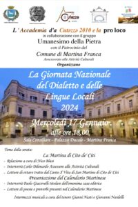 Si terrà mercoledì 17 gennaio alle 18:00 presso la Sala Consiliare del Palazzo Ducale di Martina Franca, l’evento dal titolo La Giornata Nazionale del dialetto e delle lingue locali 2024.