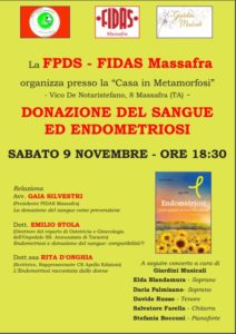 La FPDS – FIDAS Massafra organizza per sabato 9 novembre p.v. alle ore 18:30 presso la “Casa in Metamorfosi” in Vico De Notaristefano n°6 a Massafra il convegno dal titolo Donazione del sangue ed endometriosi .