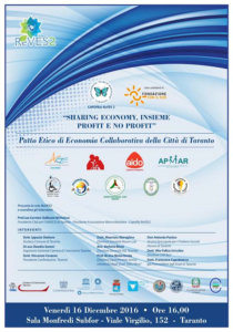 A conclusione di un percorso biennale di formazione, informazione, scambio e crescita realizzato dalle associazioni sui temi della economia collaborativa, la rete ReVES2 promuove ora una iniziativa di assoluta innovatività: un patto etico di collaborazione che unisce organizzazioni private, soggetti del mondo del no profit, amministrazione locale e organizzazioni pubbliche nel comune intento di definire strumenti e priorità strategiche legate alla sharing economy per apportare vantaggi e benefici all’intera città di Taranto.