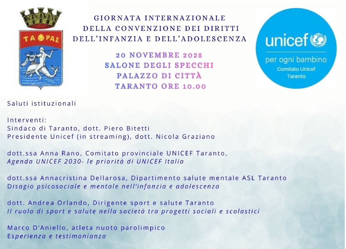 In occasione di questa ricorrenza si terrà giovedì 20 alle 10:00 presso il Salone degli Specchi di Palazzo di Città di Taranto la presentazione dell’Agenda 2030 dell’Unicef, evento organizzato dal Comune di Taranto – Assessoratoalla Pubblica Istruzione in collaborazione con il Comitato provinciale Unicef di Taranto.