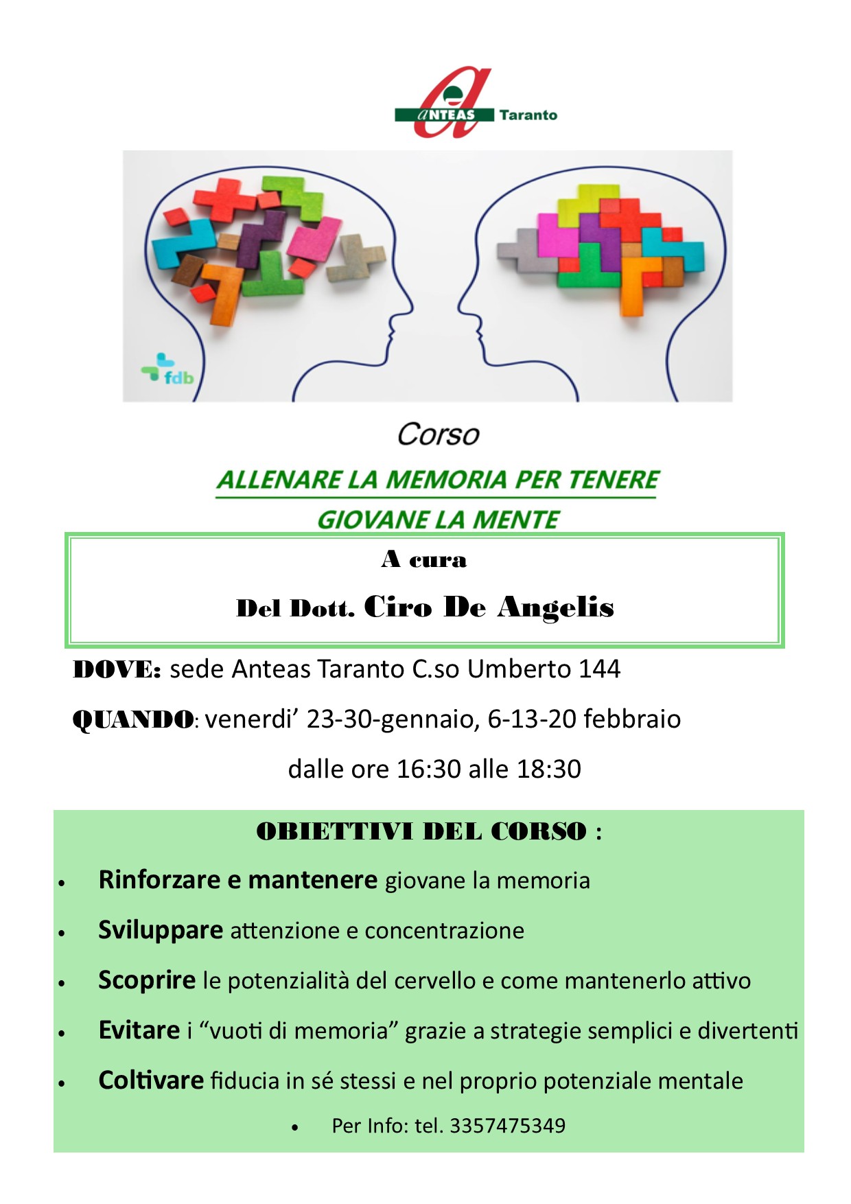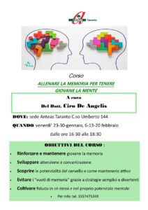 A partire dal 23 gennaio p.v. presso la sede di A.N.T.E.A.S. – Associazione nazionale tutte le età attive per la solidarietà Taranto APS, in C.so Umberto 144, prenderà il via il corso dal titolo Allenare la memoria per mantenere giovane la mente tenuto dal Dott. Ciro De Angelis, laureato in filosofia e in scienze della formazione nonché esperto in tecniche della memorizzazione.