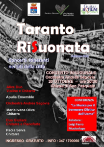 Chicca della Rassega la conferenza tenuta dal musicologo dott. Luigi Ferro, dal titolo La musica per il benessere olistico dell’Uomo in linea con le finalità di Taranto Risuonata che è quella di creare e consolidare il senso di appartenenza alla nostra città.