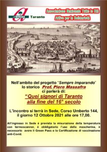 Alle ore 17.00 di domani, martedì 12 ottobre, presso la sede dell’Anteas in Corso Umberto n.144 a Taranto, si terrà la conferenza dal titolo Quei signori di Taranto alla fine del 16° secolo a cura del prof. Piero Massafra, editore e storico dalle notevoli qualità comunicative.