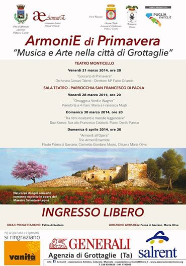 Venerdì 21 marzo p.v., alle ore 20:00, presso il Teatro Monticello di Grottaglie avrà inizio la rassegna musicale organizzata dall’Associazione Artistico Culturale Musicale ArmoniE, patrocinata dall’Amministrazione Comunale di Grottaglie, Assessorato alla Cultura e Turismo, con il patrocinio morale dell’Assessore al Mediterraneo-Cultura-Turismo della Regione Puglia, Provincia di Taranto e di Puglia Events.