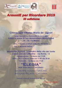 Armonie per Ricordare è l’iniziativa che racchiude il programma religioso e culturale dedicato ad una delle più belle figure del francescanesimo della Chiesa polacca. La terza edizione, anno 2019, è stato il risultato dell’attiva collaborazione e la proficua organizzazione fra la Comunità dei Padri Redentoristi di Francavilla Fontana che celebrerà il Triduo, Circolo Cittadino che, senza indugio e con piena disponibilità, nelle persone del presidente Massimo Bianco e il consigliere Raffaele Modeo, ha ospitato gli eventi culturali della Mostra e del Concerto curandone completamente l’organizzazione logistica, Associazione Sipario che, nelle persone di Tani Roma e Mada Lopalco, si occuperà delle letture dedicate a San Massimiliano, Pro Loco di Francavilla Fontana che, nelle persone del presidente Giovanni Colonna e del socio Antonio Carriere, ha curato l’allestimento della mostra e la divulgazione degli eventi, l’Associazione ArmoniE, che presieduta da Palma di Gaetano, è risultata ancora una volta “motore” dell’iniziativa e “collante armonioso” di tutti i soggetti coinvolti.
