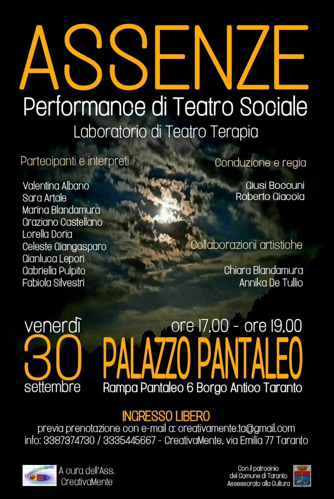 Venerdì 30 settembre alle ore 17:00 e alle ore 19:00 nella Sala Atrio del Palazzo Pantaleo a Taranto andranno in scena le due uniche rappresentazioni della 12° performance di Teatro Sociale dell’Associazione Scientifico-Culturale e Terapeutica CreativaMente, dal titolo ASSENZE realizzata al termine del Laboratorio di Teatroterapia annuale.