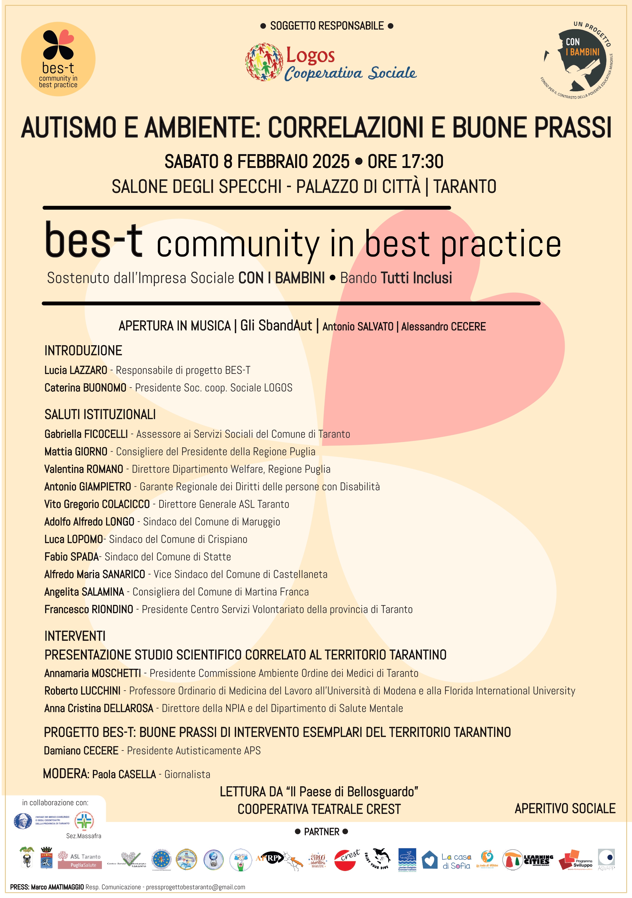 Si terrà il prossimo 08 febbraio alle ore 17.30 presso il Salone degli Specchi di Palazzo di Città a Taranto l’evento pubblico Autismo e ambiente: correlazioni e buone prassi promosso dalla rete di “BES-T Community in Best Practice”, un progetto selezionato da “Con i Bambini” nell’ambito del Fondo per il contrasto della povertà educativa minorile.