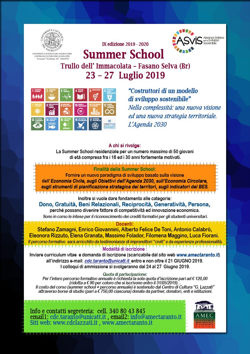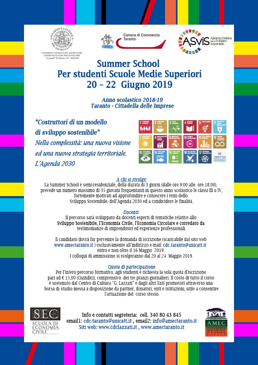 Il Centro di Cultura “G. Lazzati” dell’Università Cattolica – Taranto – in collaborazione con la Camera di Commercio di Taranto, e con l’adesione dell’ASVIS (Alleanza Italiana per lo Sviluppo Sostenibile) – nella continuità di un impegno ispirato alla Economia Civile e nelle mete dell’Agenda 2030, promuove come intenso momento formativo la Summer School “Costruttori di un modello di sviluppo sostenibile. Nella complessità: una nuova visione ed una nuova strategia territoriale. L’Agenda 2030”.