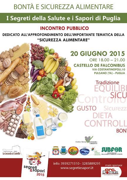 La Pro Loco di Pulsano, in collaborazione con l’Istituto d’Istruzione Secondaria Superiore Mediterraneo, con il patrocinio di Regione Puglia, Comune di Pulsano, Subfor – Camera di Commercio di Taranto, Centro Servizi Volontariato di Taranto, GAL Colline Joniche, organizza per sabato 20 giugno il meeting Bontà e Sicurezza Alimentare, che rientra nell’ambito della V Edizione di Segreti & Sapori, la manifestazione enogastronomica e fieristica pensata dalla Pro Loco di Pulsano e giunta alla sua V edizione che si terrà a luglio.