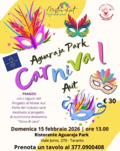 Alle 13.00 i volontari e i ragazzi e le ragazze nello spettro autistico, seguiti dall’associazione nell’ambito del progetto Mister Aut, accoglieranno gli avventori come addetti alla sala del Ristorante “Aguaraja Park” in Viale jonio 370 a Taranto per il pranzo di Carnevale!