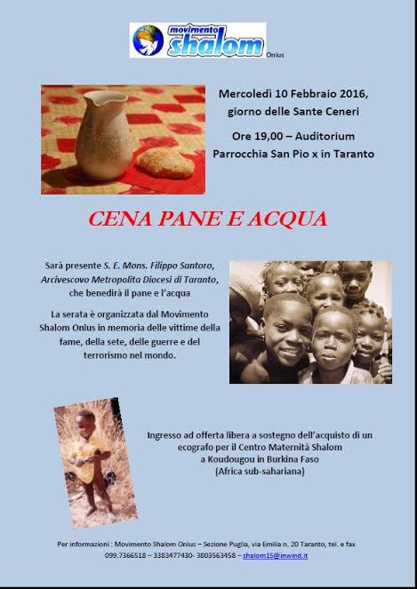La condivisione dei beni della Terra è infatti un’istanza di giustizia, un invito a sfamare e dissetare i popoli che vivono in tante parti del mondo 365 giorni all’anno di quaresima, senza cibo e senza acqua. Per una sera mangiare pane e acqua ci renderà più vicini a milioni di dimenticati della Terra. Con l’occasione sarà presentato un nuovo progetto di raccolta fondi a sostegno della sanità in Burkina Faso che la Sezione Puglia del Movimento Shalom sta intraprendendo in quel paese.