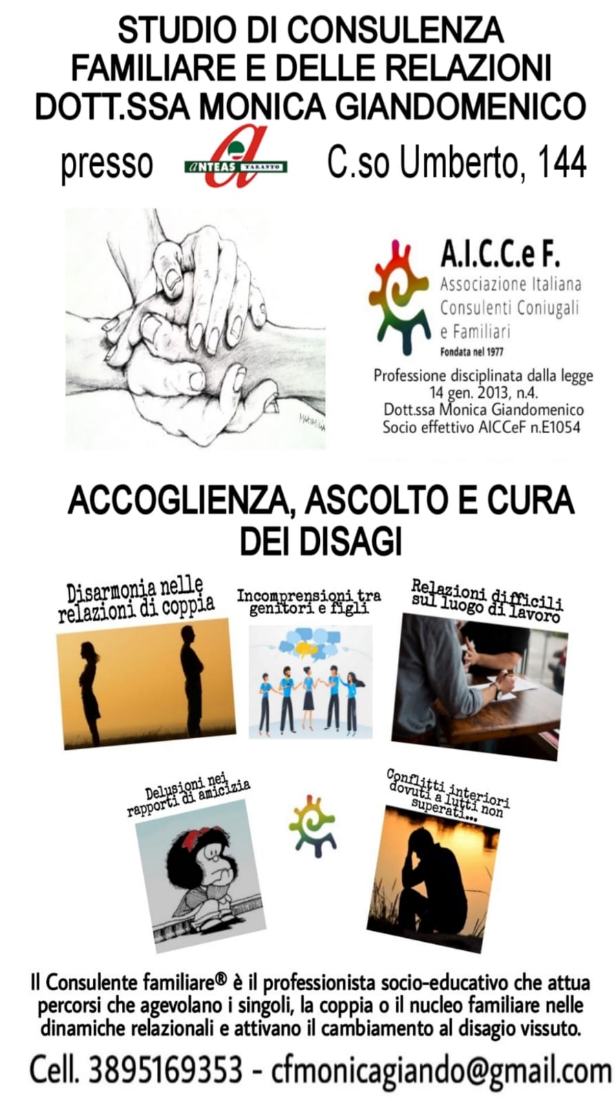Anche quest’anno presso la sede dell’A.N.T.E.A.S. – Associazione nazionale tutte le età attive per la solidarietà Taranto APS in C.so Umberto 144, sarà attivo un centro d’ascolto gestito da personale qualificato che risponderà alle esigenze di natura psicologica di tutti coloro che ne faranno richiesta.