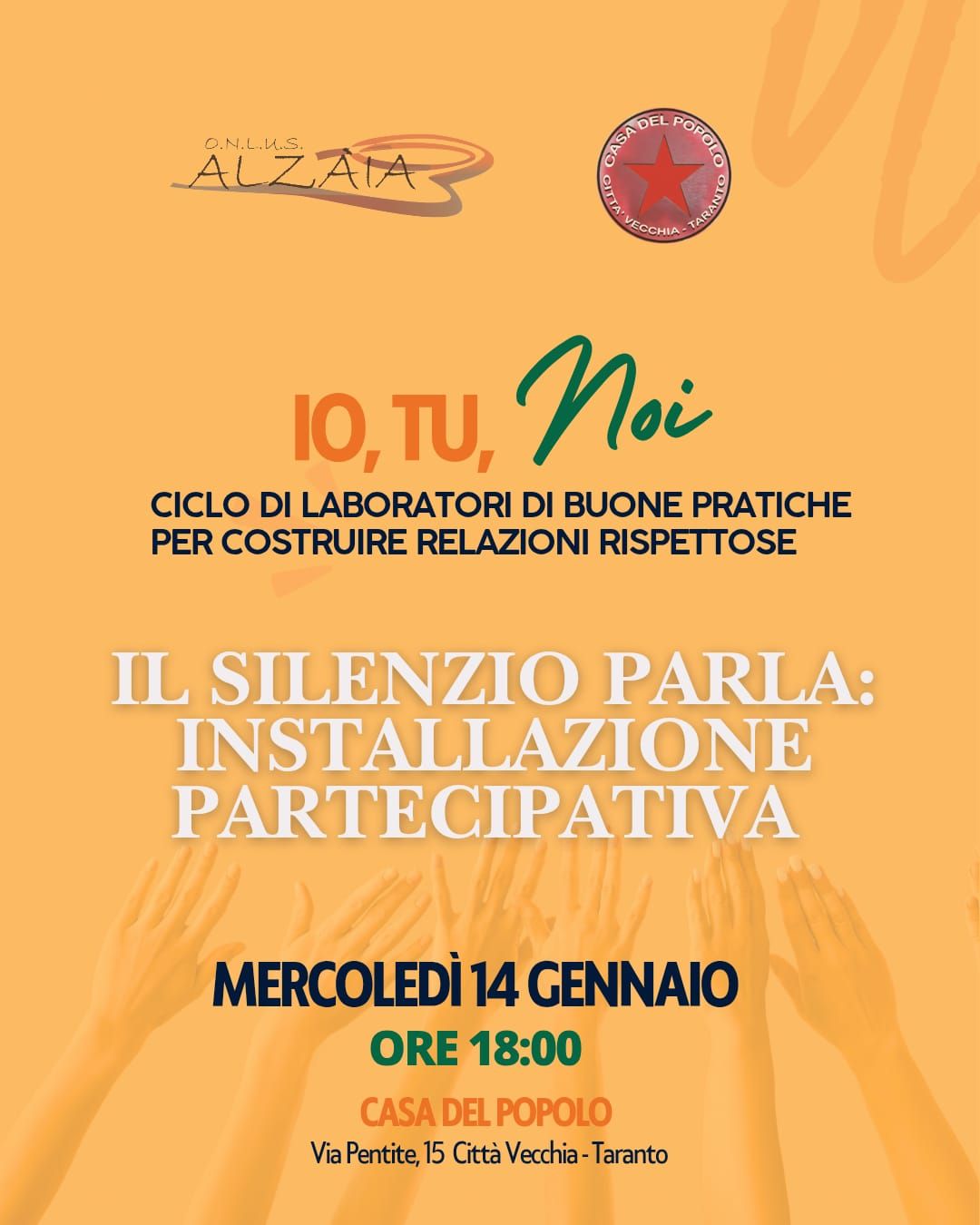 Penultimo appuntamento, mercoledì 14 gennaio alle 18:00 presso la Casa del Popolo in via Pentite, 15 nel cuore della Città vecchia di Taranto, del Ciclo di laboratori di buone pratiche per costruire relazioni rispettose denominato Io, tu, noi promosso da Associazione Alzaia Onlus ETS.