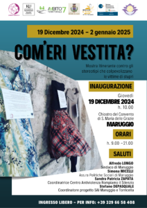 Il Centro Antiviolenza Rompiamo il Silenzio, in collaborazione con il Comune di Maruggio, l’Ambito Territoriale n. 7, il progetto SAI di Maruggio e Torricella e l’Associazione Lotus, inaugurano giovedì 19 dicembre alle 10:00 nel suggestivo chiostro del Convento di S. Maria delle Grazie a Maruggio, la mostra Com’eri vestita? In esposizione 17 abiti che raccontano 17 storie di donne violate: tute, pigiami, divise da lavoro, maglioni a collo alto che riproducono quelli reali indossati al momento dell’abuso.