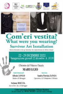 È lungo quei fili di cotone che corre la mostra itinerante Com’eri vestita?, nata per destrutturare i pregiudizi che colpevolizzano le donne vittime di stupro e abusi, che approda a Maruggio, presso il Chiostro del Palazzo Comunale. La mostra verrà inaugurata giovedì 22 dicembre, alle ore 18.30, e sarà possibile visitarla anche nelle giornate delle festività natalizie, fino al 29 dicembre.