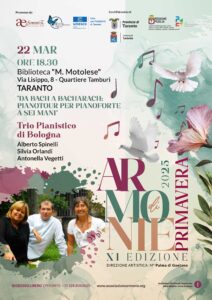 Il primo appuntamento, in stretta collaborazione con l’Associazione culturale Marco Motolese ODV e Club per l’Unesco di Taranto, è previsto per sabato 22 marzo alle ore 18.30, nella Biblioteca “Marco Motolese” in via Lisippo n. 8 – Quartiere Tamburi.