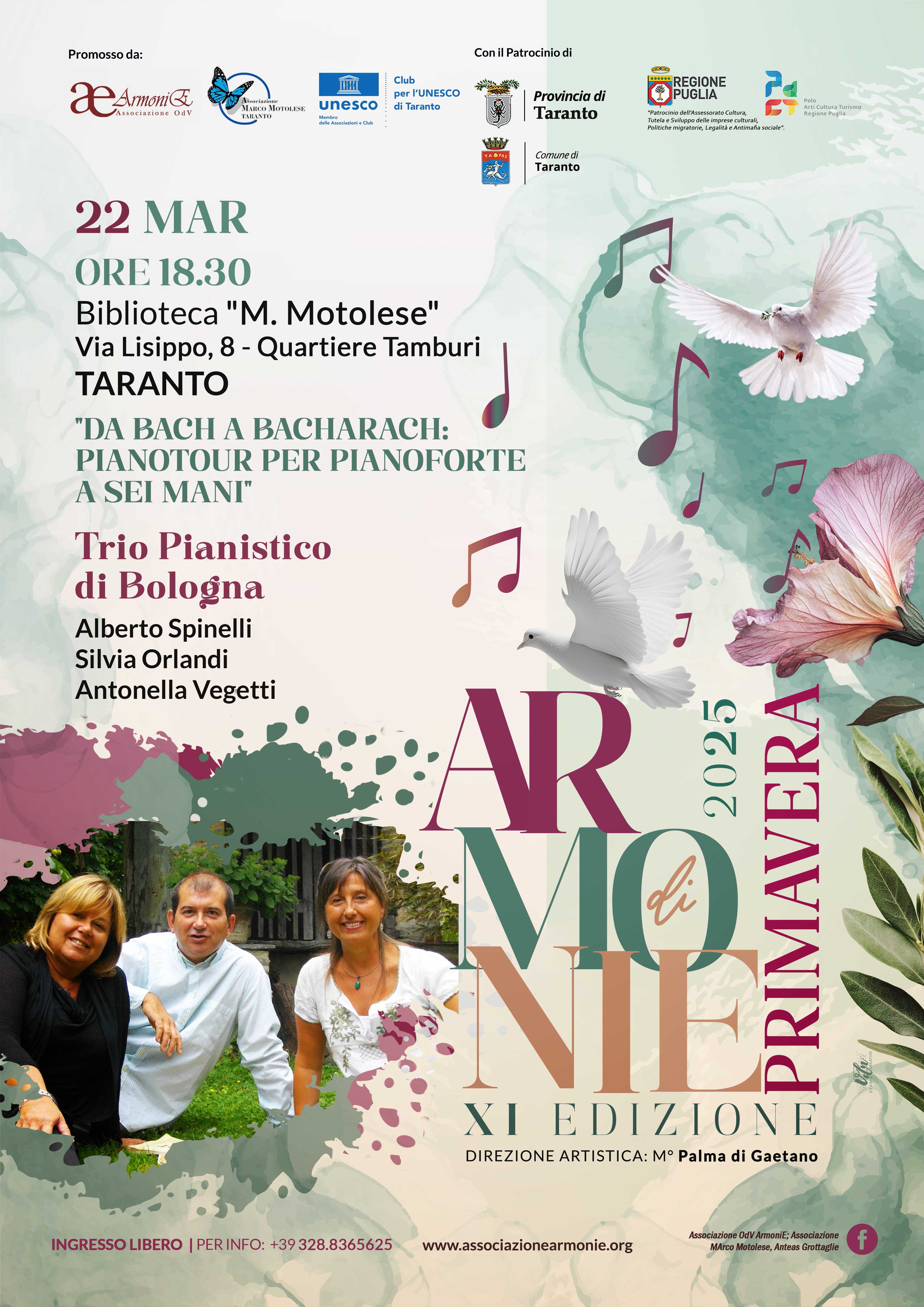 L’intera programmazione di “ArmoniE di Primavera – XI edizione”, con la Direzione Artistica del M° Palma di Gaetano, gode del Patrocinio della Regione Puglia, della Provincia di Taranto e dei Comuni di Villa Castelli, Taranto, Grottaglie e Lizzano.