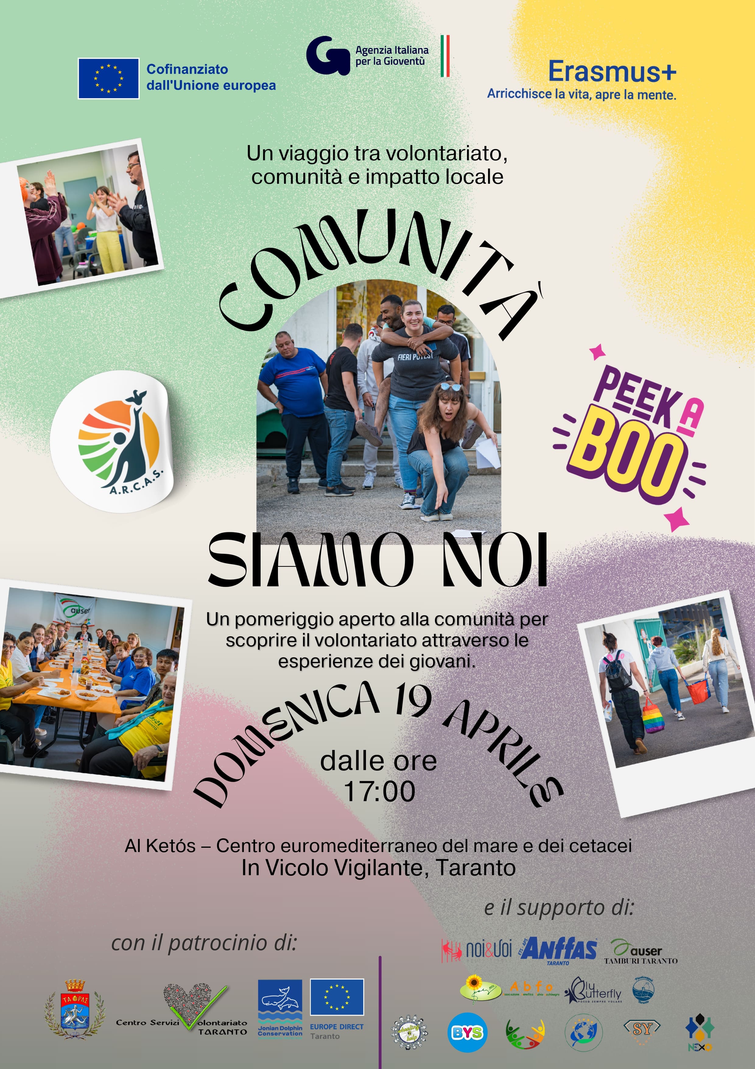 Nell’ambito dello Youth Exchange “Peek-A-Boo” l’ARCAS Puglia APS organizza l’evento pubblico finale dal titolo Comunità Siamo Noi che si terrà domenica 19 aprile alle ore 17:00 presso Ketós – Centro Euromediterraneo del Mare e dei Cetacei in Vicolo Vigilante a Taranto.