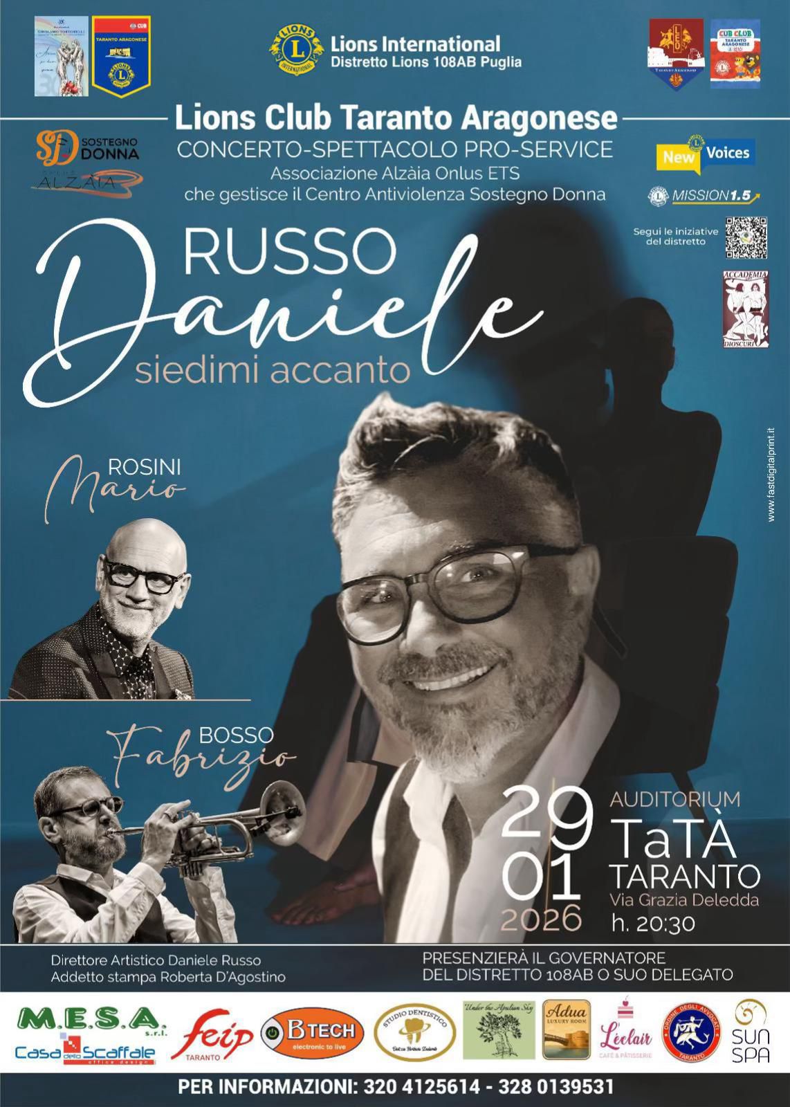 Il concerto-spettacolo Siedimi AccantoΒ organizzato dal Lions International – Distretto Lions 108AB Puglia nasce per sostenere una causa che riguarda tutti noi: il contrasto alla violenza sulle donne e il lavoro quotidiano che, l’Associazione Alzaia Onlus ETSΒ porta avanti sul territorio con cura, responsabilitΓ e amore.