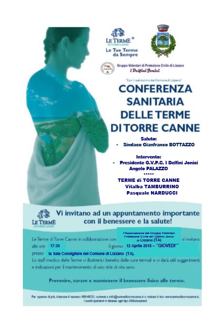 Le Terme di Torre Canne in collaborazione con il Gruppo di Volontari di Protezione Civile di Lizzano – i Delfini Jonici organizzano per giovedì 12 aprile presso la Sala Consiliare del Comune di Lizzano alle 17:30 un appuntamento con la salute e il benessere: Conferenza sanitaria delle Terme di Torre Canne.