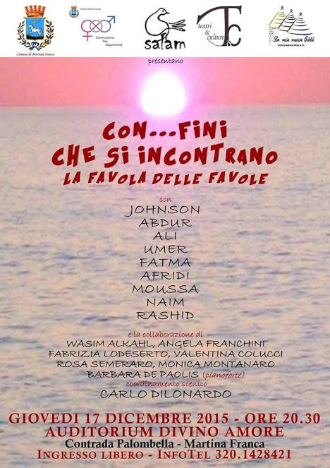 Immagine ben diversa da quella che sarà presentata nello spettacolo teatrale Con…fini che si incontrano, che si terrà domani giovedì 17 dicembre, alle 20.30 presso l’Auditorium “Divino Amore” – Contrada Palombella a Martina Franca organizzato dall’Associazione Salam Ong, col patrocinio del Comune di Martina Franca e della Commissione Pari Opportunità.