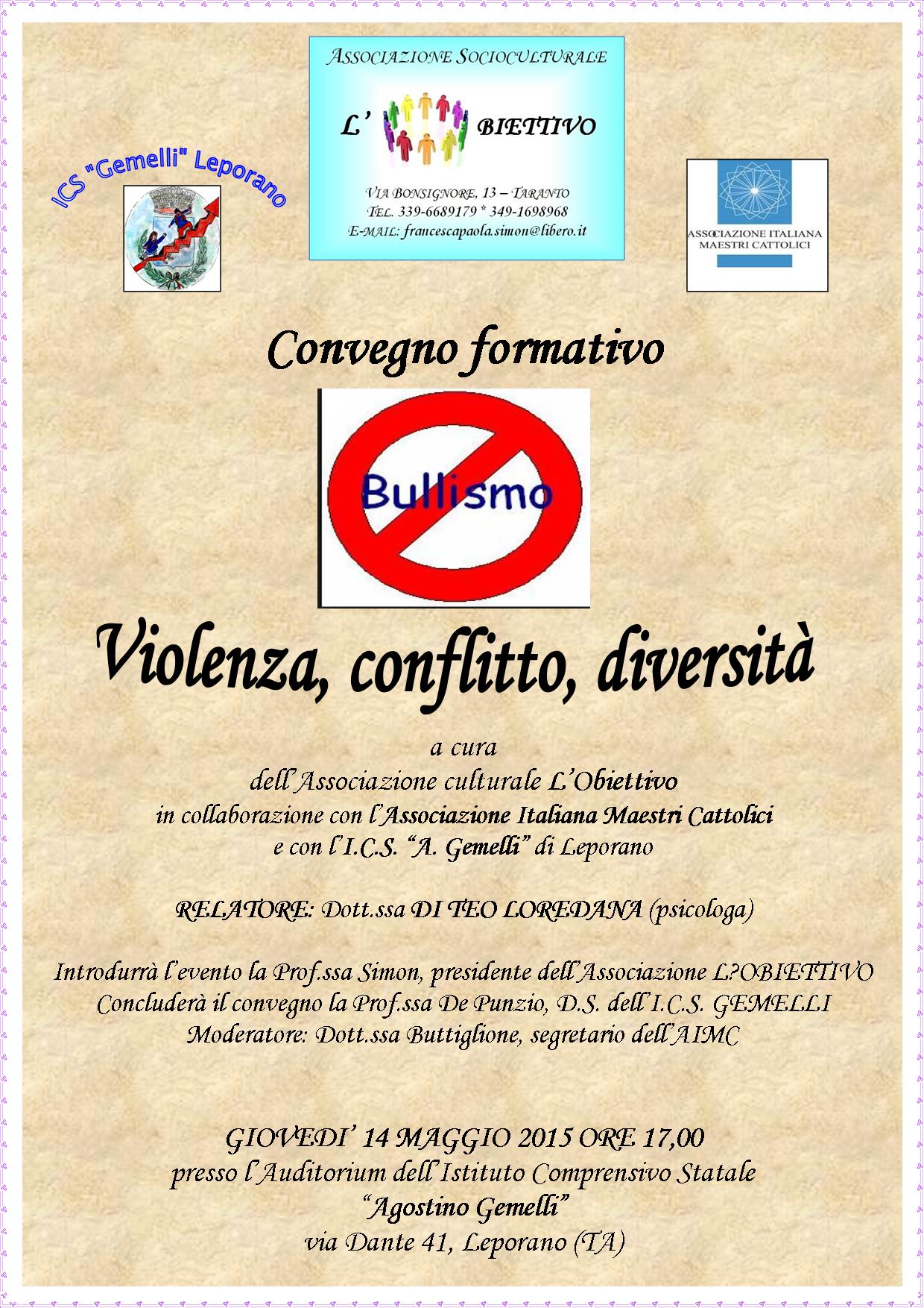 Si terrà giovedì 14 maggio p.v. alle ore 17:00 presso l’Auditorium dell’Istituto Comprensivo Statale “Agostino Gemelli” in Via Dante, 41 a Leporano il convegno dal titolo Violenza, conflitto, diversità.