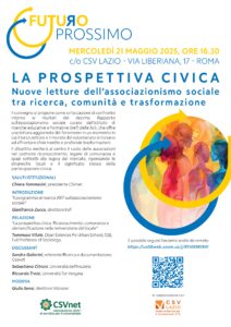 Si terrà mercoledì 21 maggio dalle 16.30 alle 17.30 il convegno dal titolo La prospettiva civica. Nuove letture dell’associazionismo sociale tra ricerca, comunità e trasformazione, in programma in presenza a Roma presso la sede di CSVnet e online.