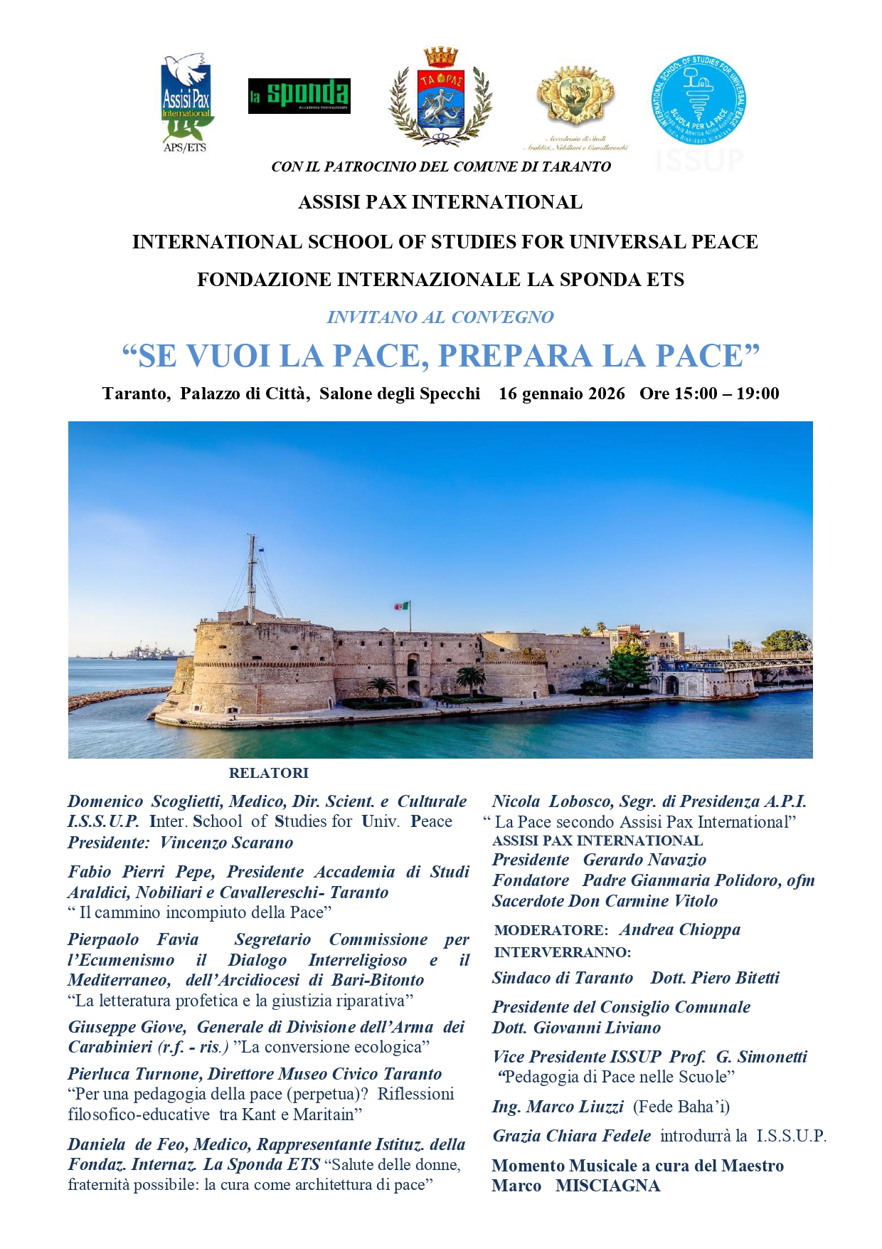 La I.S.S.U.P. – International School of Studies for Universal Peace, in collaborazione con Assisi Pax International e La Sponda ETS organizzano per venerdì 16 gennaio il Convegno Se vuoi la pace, prepara la pace che si terrà nel Salone degli Specchi – Palazzo di Città a Taranto, dalle ore 15:00 alle 19:00.