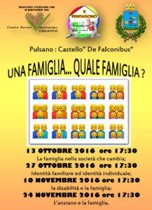 Giovedì 10 novembre p.v. a partire dalle 17:30, presso il Castello de Falconibus di Pulsano terzo appuntamento del convegno organizzato dall’Associazione Il Pentagono con il patrocino del CSV Taranto. L’obiettivo è quello di creare incontri con psicologi e associazioni del settore, approfondire e discutere sui vari aspetti della famiglia che costituisce ancor oggi la cellula base, il nucleo vitale della società.