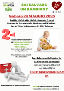 Si svolgerà sabato 24 maggio il corso BLSD-P (pediatrico) di primo soccorso organizzato dal Centro di Aiuto alla Vita – CAV di Talsano finalizzato all’insegnamento delle manovre di disostruzione e rianimazione pediatrica.