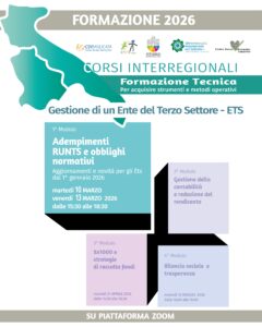 I Centri di servizio al volontariato di Puglia e Basilicata organizzano il corso on line “Gestione di un Ente del Terzo Settore – ETS” della durata di 15 ore, articolato in 4 moduli e rivolto agli ETS del territorio.