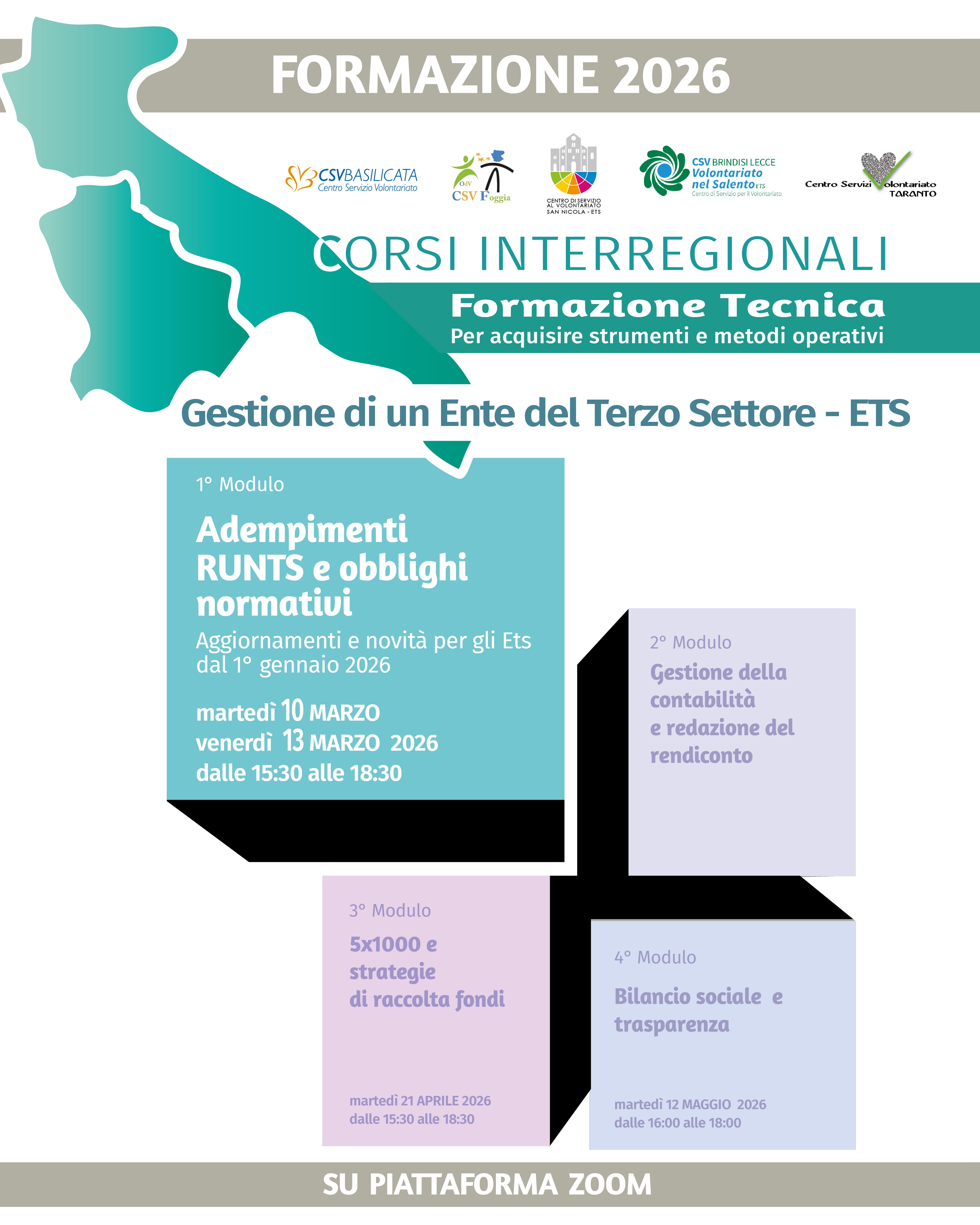 La formazione si terrà su piattaforma ZOOM, il link per partecipare agli incontri sarà trasmesso, il giorno prima dell’inizio del modulo, all’indirizzo e-mail comunicato nella scheda di iscrizione.