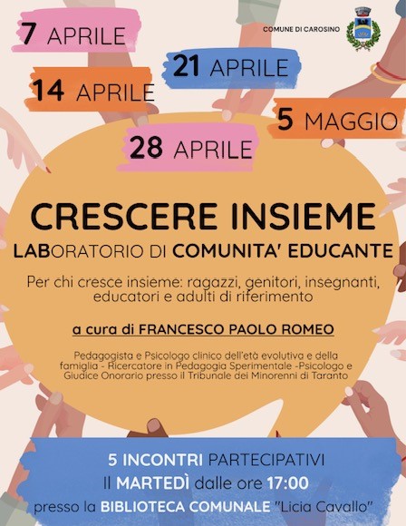 Il Comune di Carosino promuove un laboratorio strutturato dedicato alla Comunità Educante, si tratta di un percorso gratuito articolato in 5 incontri aperto non solo ai genitori, ma anche a insegnanti, educatori e ragazzi.