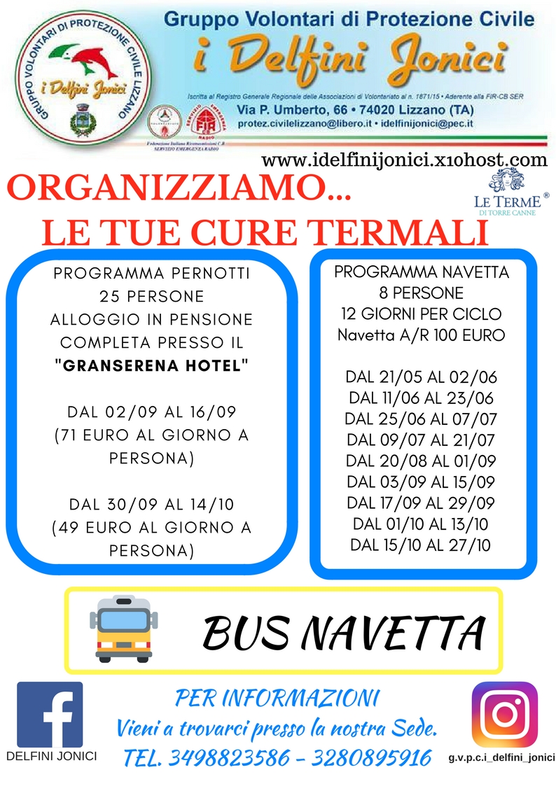 Il Gruppo Volontari di Protezione Civile I Delfini Jonici organizza dal 2 al 16 settembre e dal 30 al 14 ottobre un programma di cure termali presso le Terme di Torre Canne.